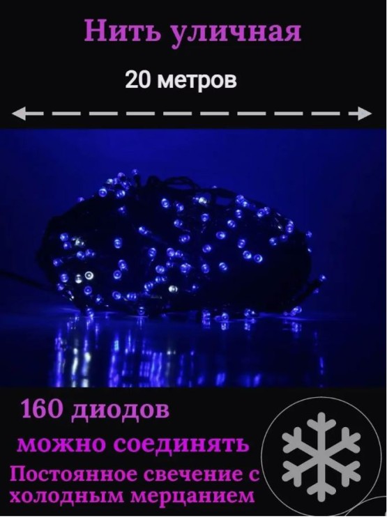 - Гирлянда уличная 20м. 160 LED, темный провод, Синий с мерцанием (можно соединять) (арт.wm20-blue)